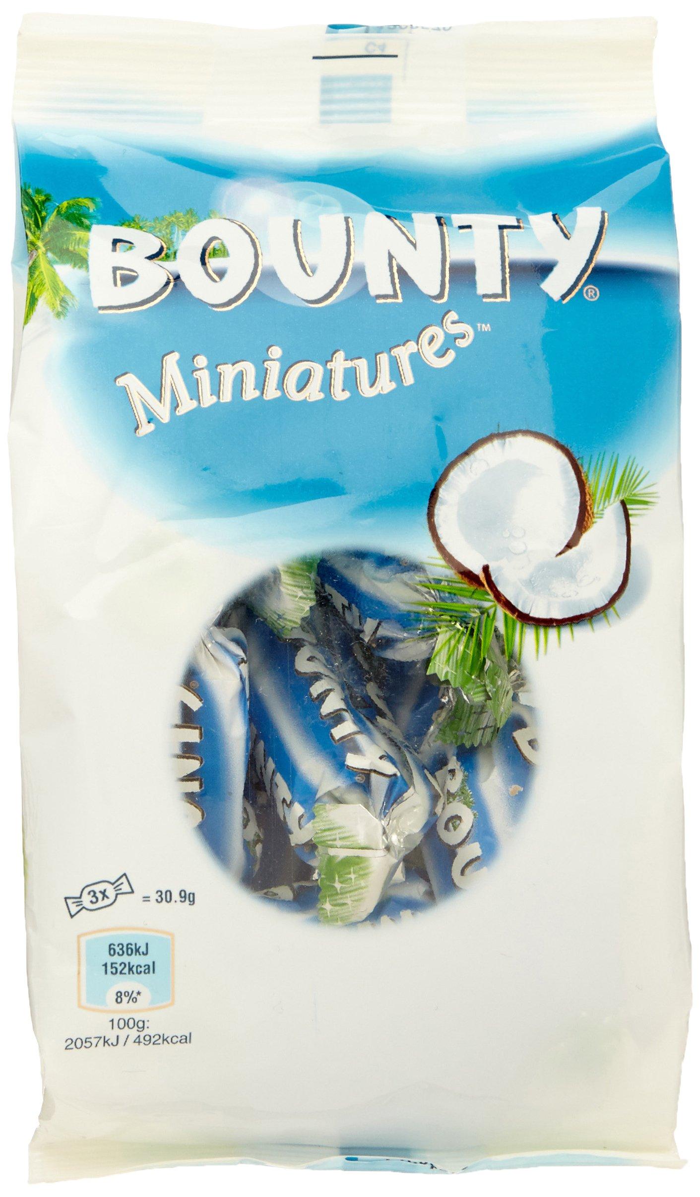 Milk chocolate, filled with juicy, white coconut cream. The exotic pleasure. Bounty Miniatures offer you the coconut classic in portions. The mini bars made of milk chocolate are filled with gorgeous, juicy, white coconut pulp and take you to the South Seas.