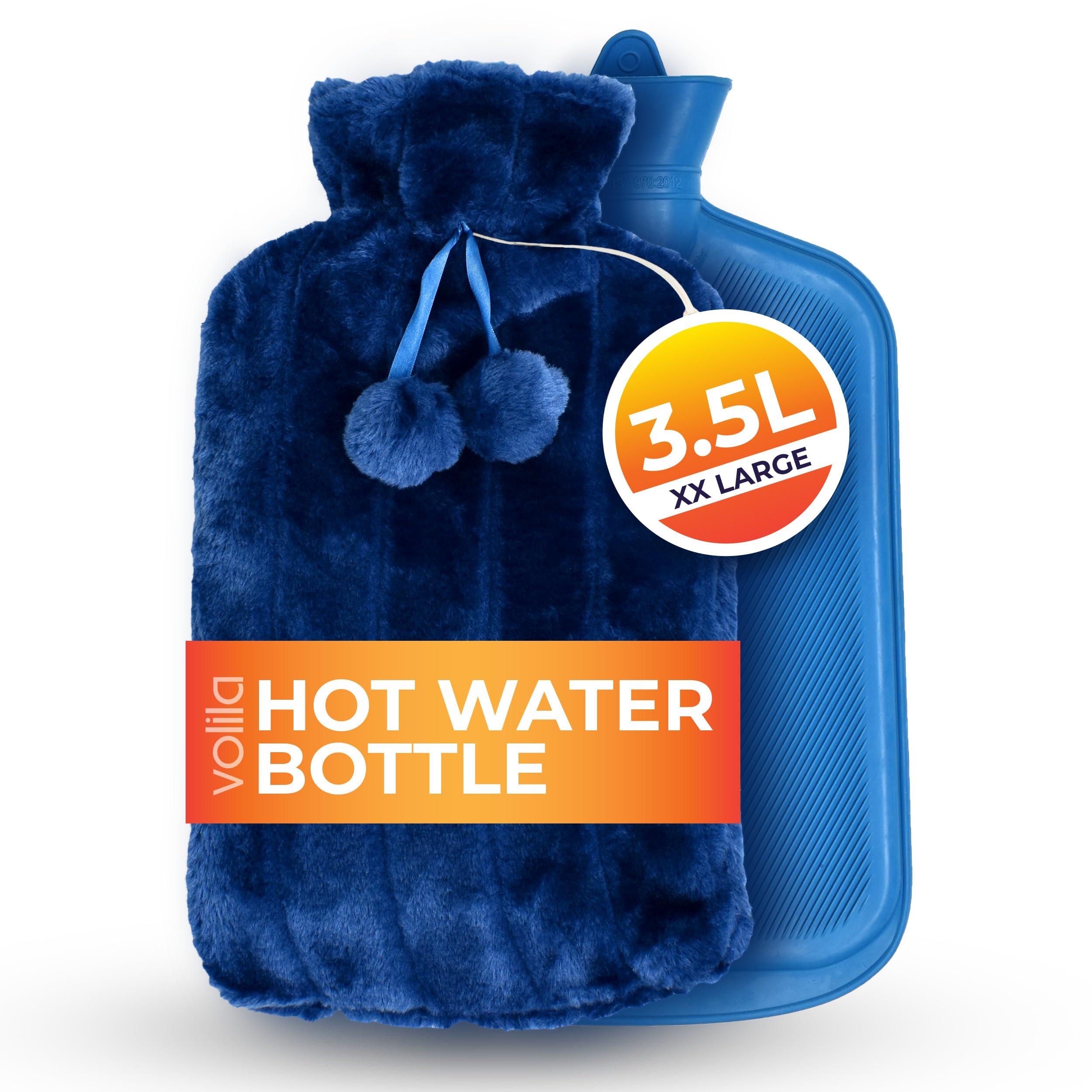 - PRODUCT FEATURES The Blue hot pack is made of rubber and a hard plastic screw-type stopper. It has a capacity of 3.5 litres, a height of 44cm and a width of 22.5cm. The hot water bottle rubber itself has a ribbed design and offers a better experience as they diffuse the heat from your hot bag, giving a feeling of comfortable "warmth" rather than excessive heat. Plus, it's safe and easy to usejust pour in hot water, seal and use.